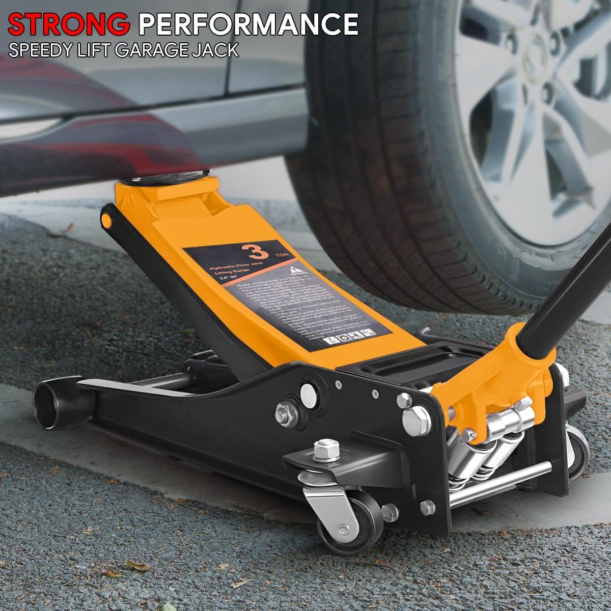 SPEEDY LIFT GARAGE JACK – This Hydraulic Floor Jack features a 3 ton (6,000 lb) capacity with a min lifting height of 3″ and a max height of 20″. Dual piston pump allows you to easily lift the jack up to desired height. It is great for garage service and heavy-duty industrial use.
