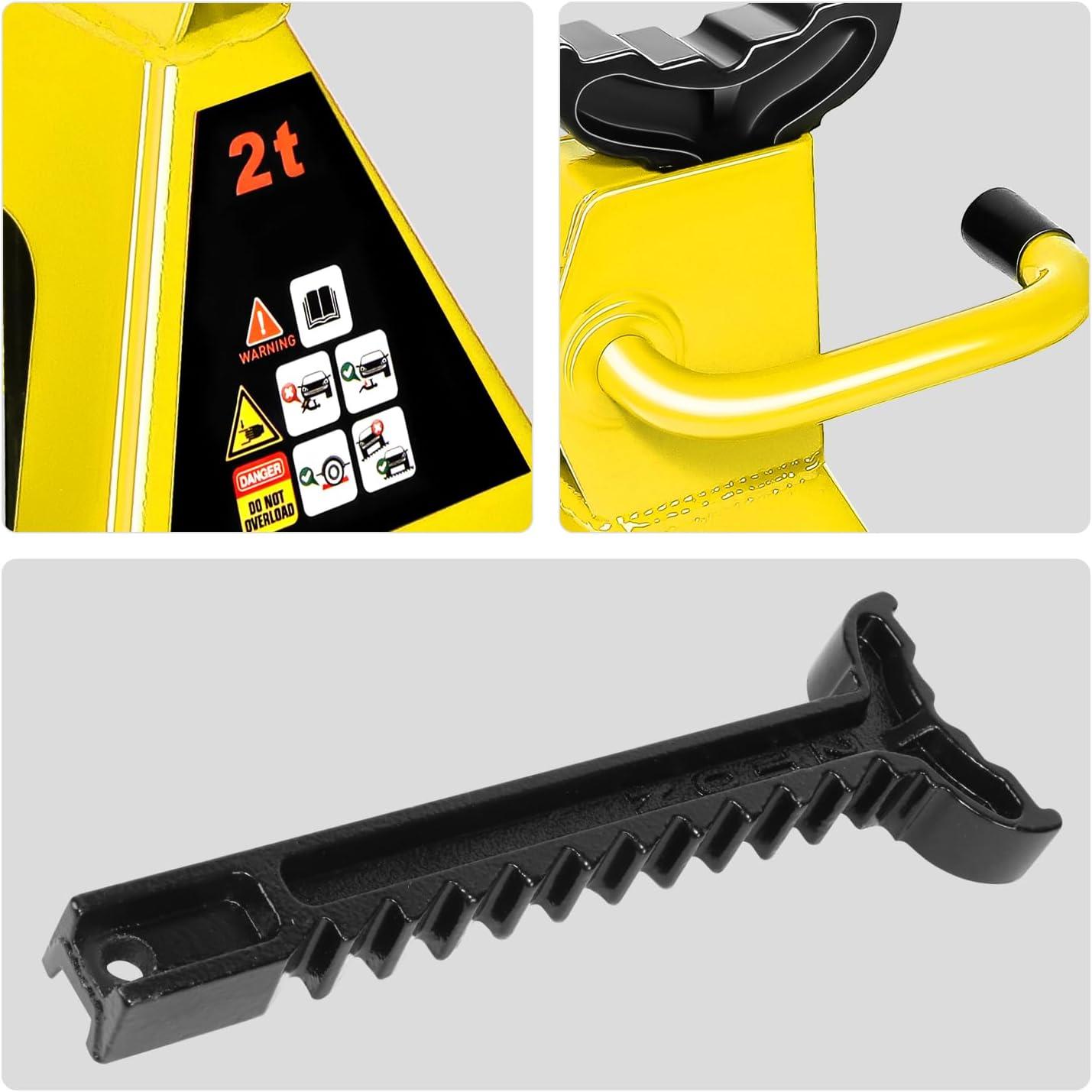 PROTECTION DESIGN – Integrated overload protection valve prevents you from lifting items weighing more than the jack's capacity. The large saddle provides extra stability and helps protect your vehicle. Jack stands have locking lever design for extra protection.