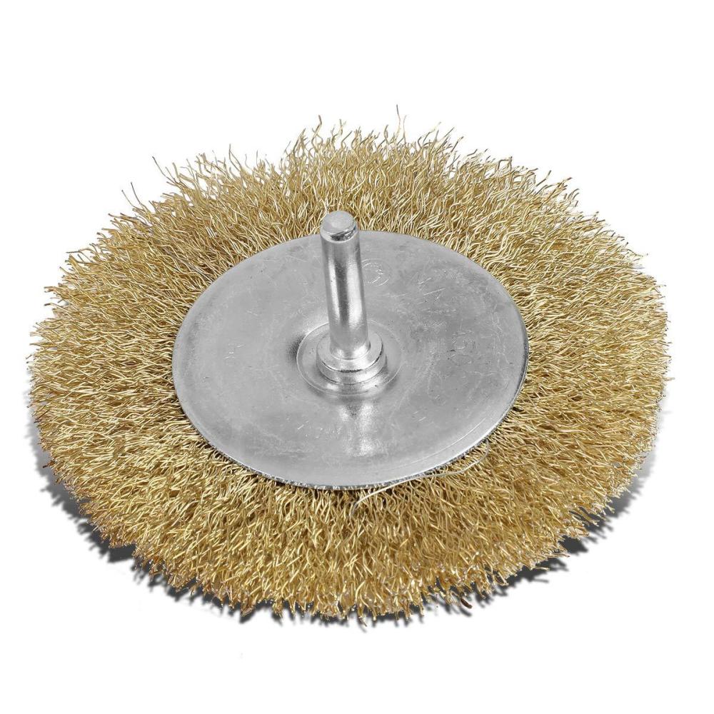 BRASS WIRE WHEEL – 4-Inches diameter wheel brush, with 0.2 inches shank, the bristles are made of carbon steel 0.012-inch thick wire.