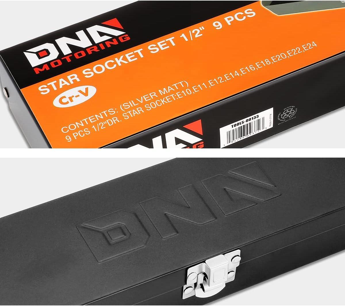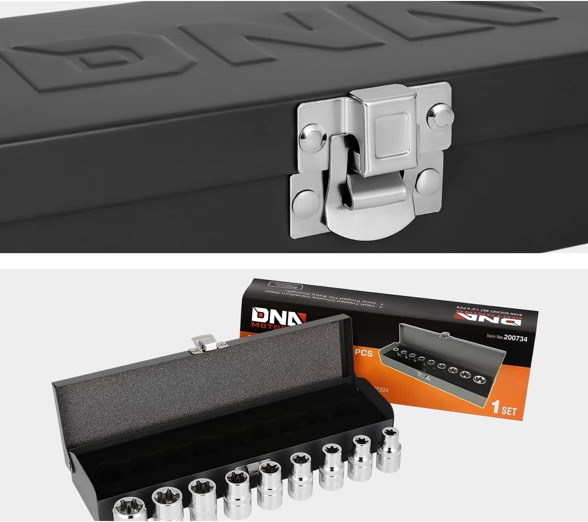 DNA Motoring TOOLS-00133 9 Pieces 1/2-Inch Drive External Torx Socket Set – E10, E11, E12, E14, E16, E18, E20, E22, E24, w/Tin Carrying Case(External Torx Socket Set)