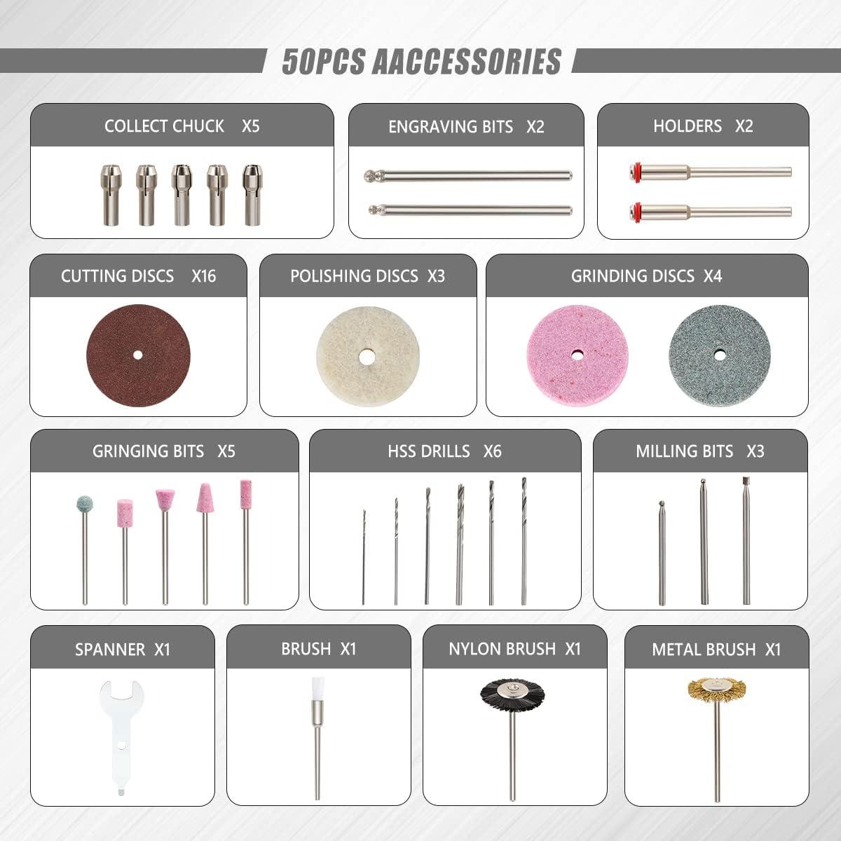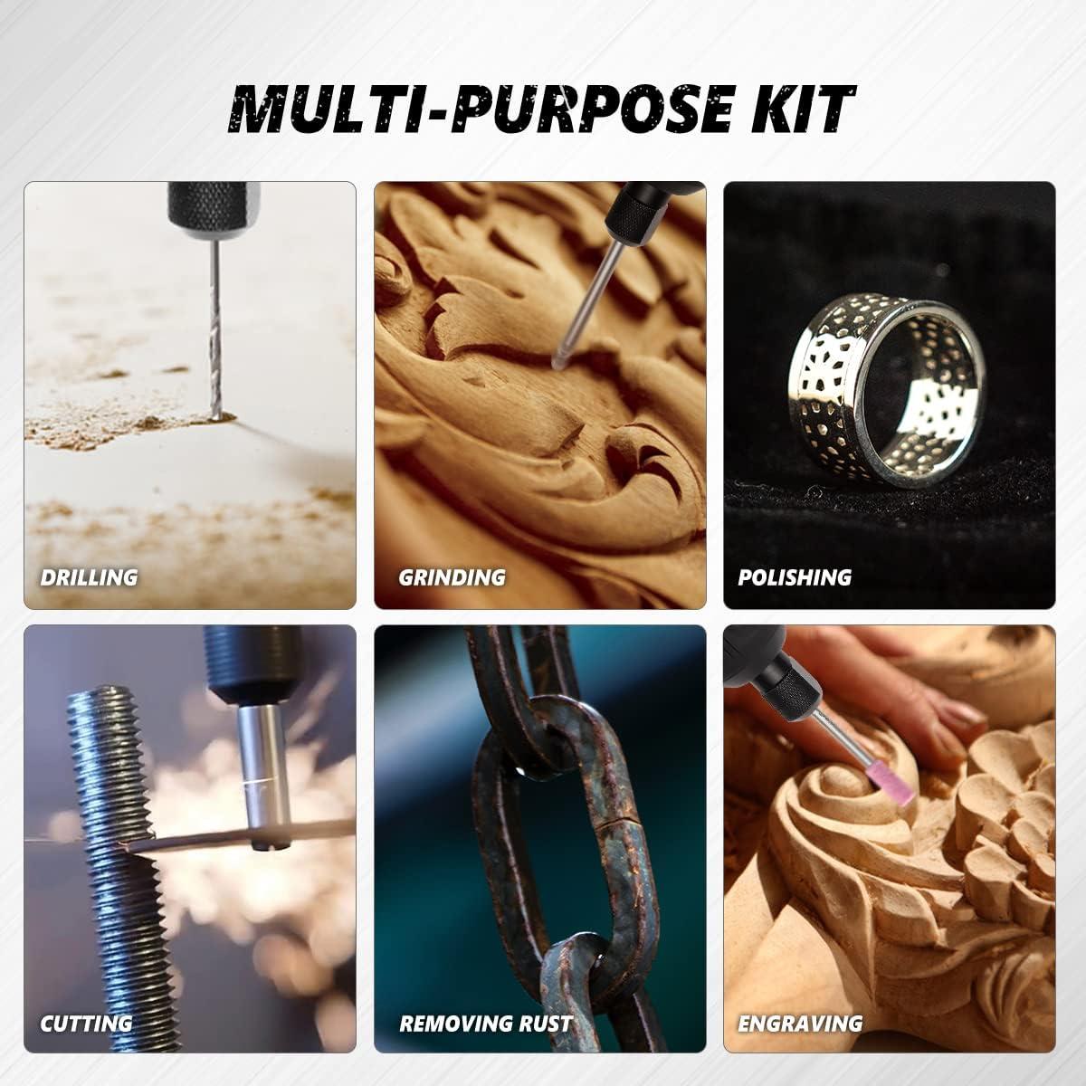 MULTIFUNCTION SET – The kit is equipped with various accessories, suitable for cutting, polishing, grinding, engraving, drilling. easy to work on plastics, stone, ceramics, soft wood, metal, hardwood, steel.
