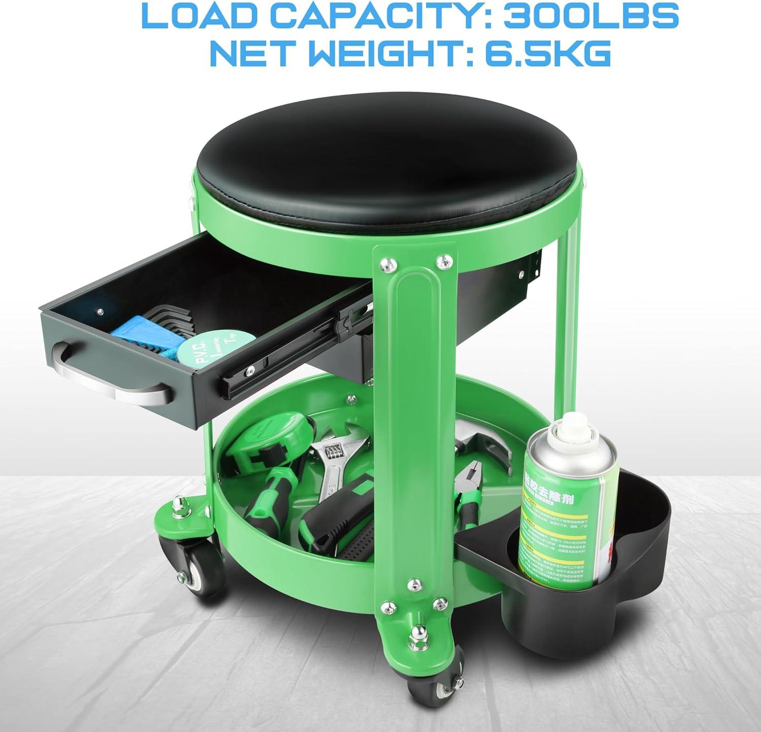 DNA Motoring TOOLS-00197 Round Mechanics Roller Seat Creeper Stool With Padded Cushion, Tool Storage Drawer & Tray, 300 Lbs Max Weight Capacity(Green)