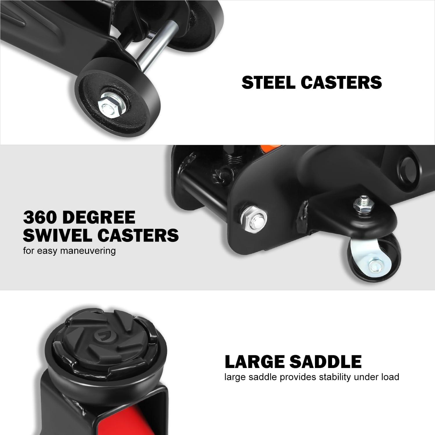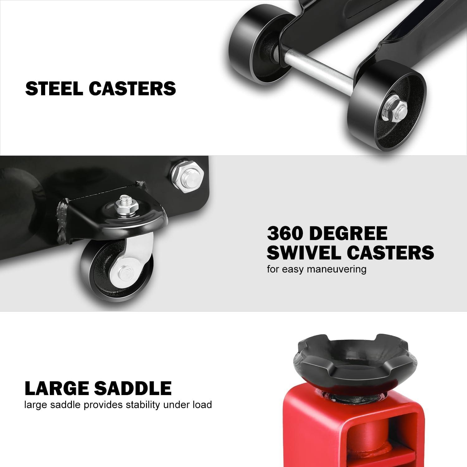 OVERLOAD PROTECTION & EASY JACK POSITIONING – Built-in dependable safety release valve triggers in the event of an overload to prevent damage or injury. The large saddle provides extra stability and helps protect your vehicle.