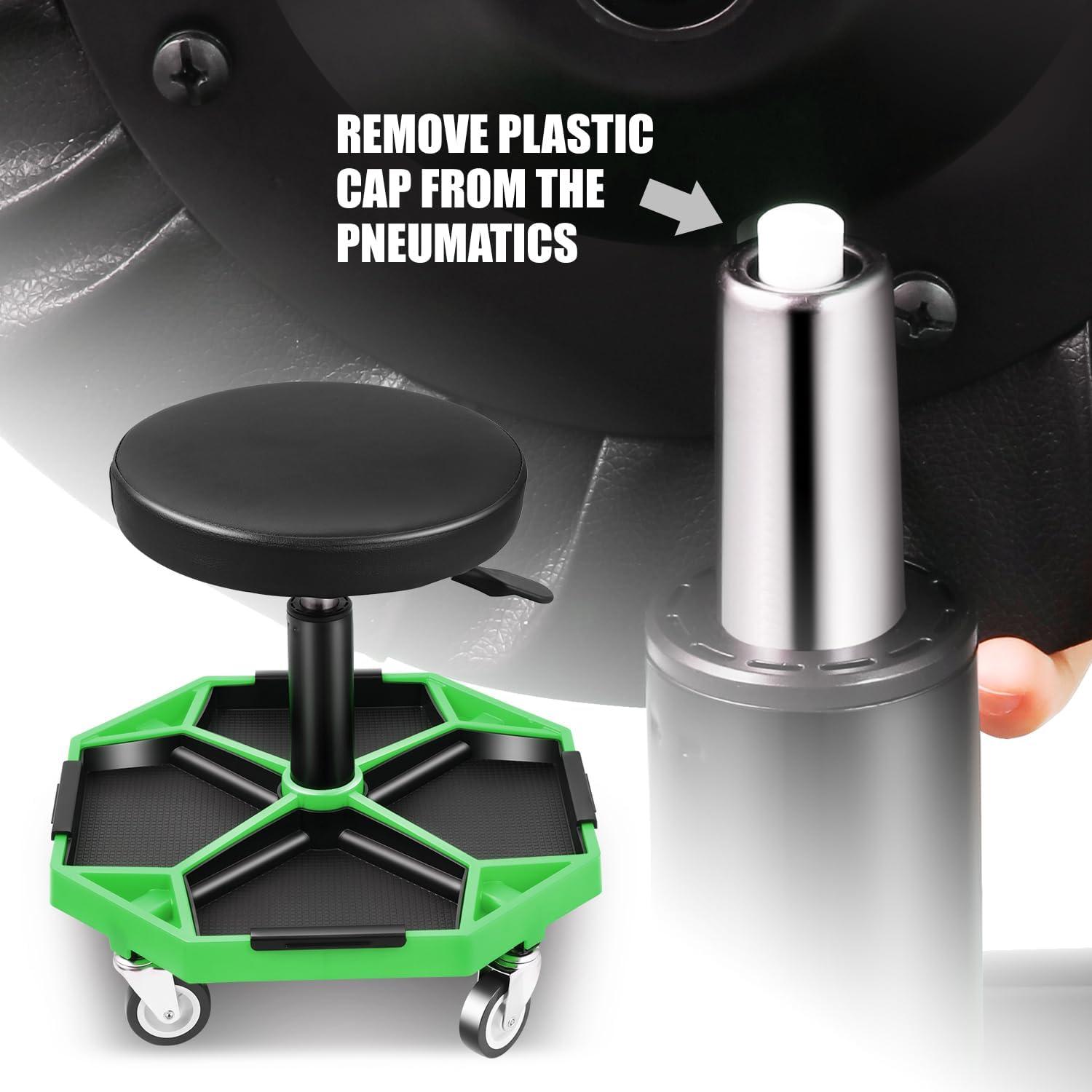 DNA MOTORING TOOLS-00253 Adjustable Height Pneumatic Garage Seat Rolling Mechanic Stool with Tool Tray Storage,300lbs Max Weight Capacity(Green)