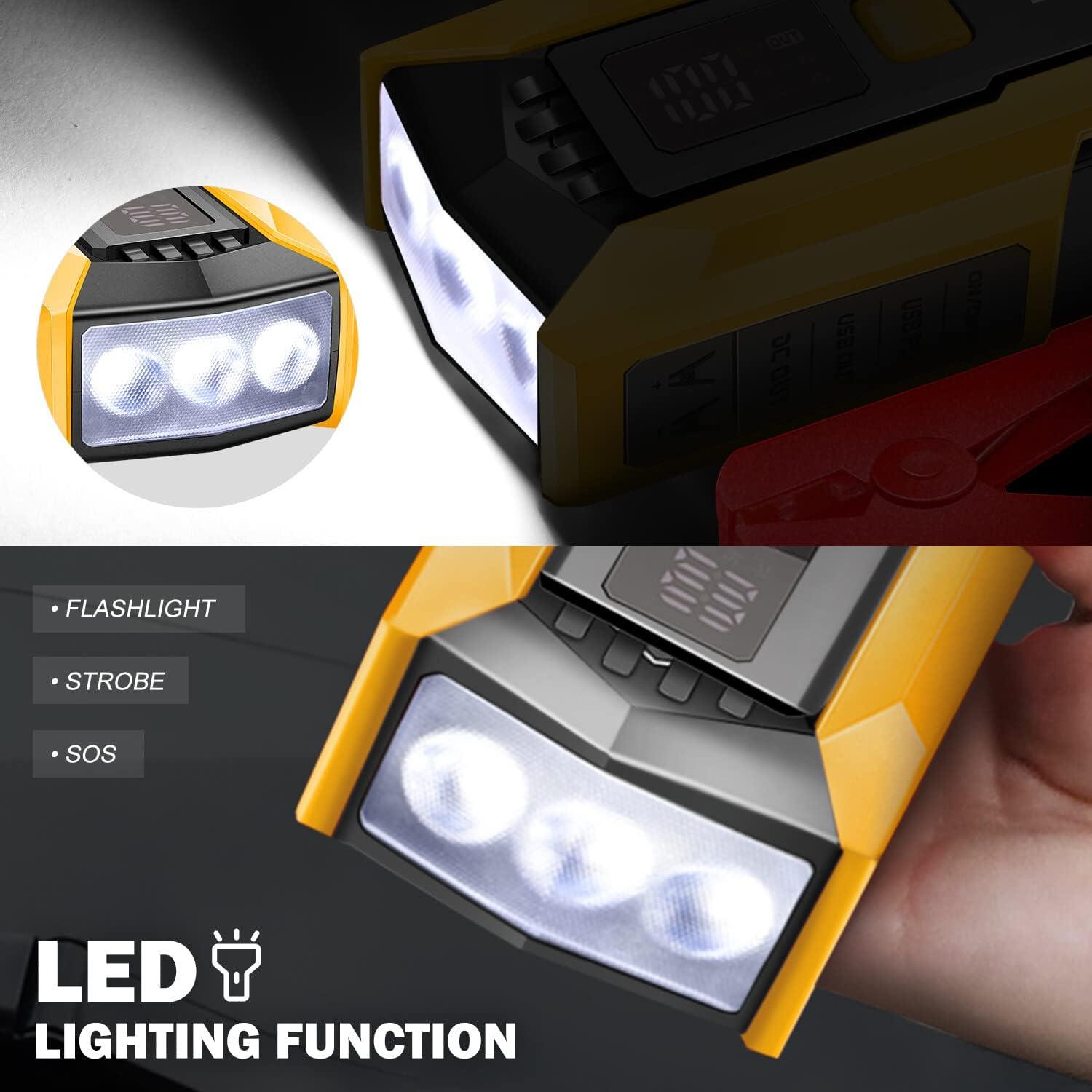 3-IN-1 LED EMERGENCY LIGHTS – This Multi-functional Jump Starter has a built-in LED flashlight with 3 modes (strong light/flash/SOS) for illumination purposes or to signal an emergency.